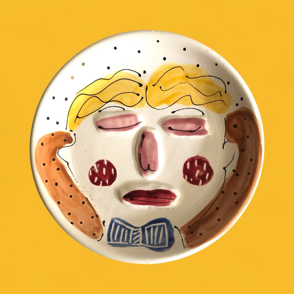 9” Turquoise Lady Plate is a distinguished member of the dinner party plate series. If you like her you may be interested in some of the other guest plates. Can you imagine the dinner party attended by these impressive guys and gals? Each measures 9” in diameter and is thrown from low fire white earthenware and decorated with bold colors in a majolica glazing process.