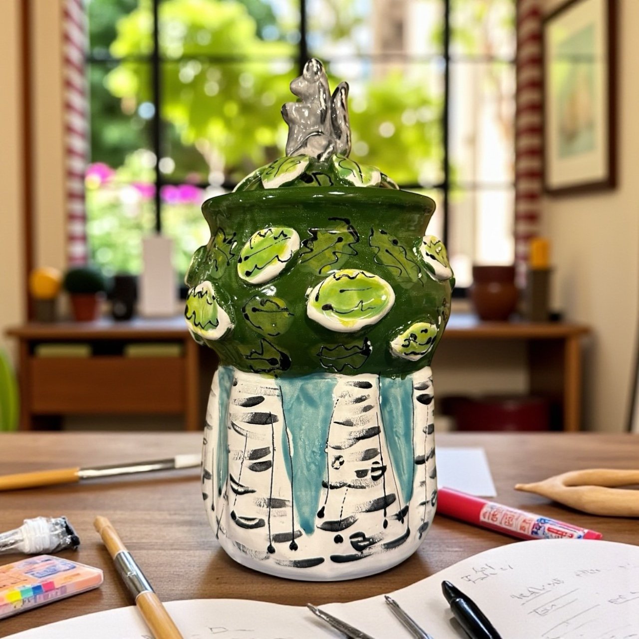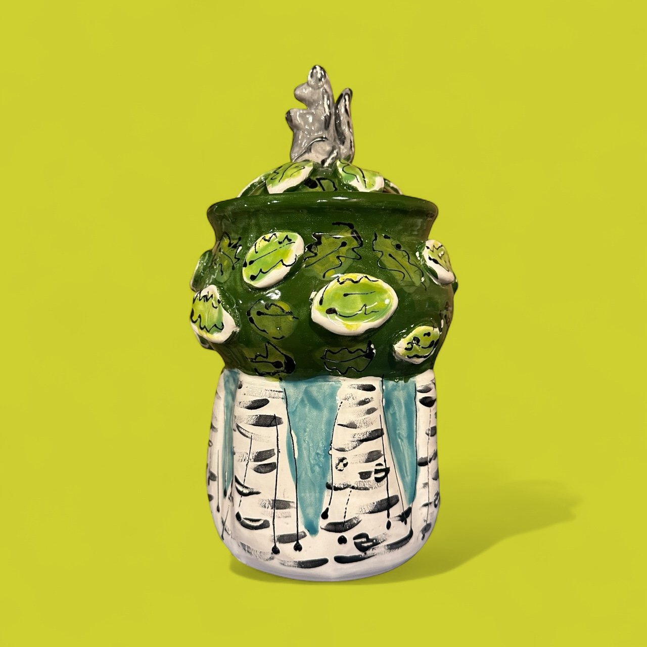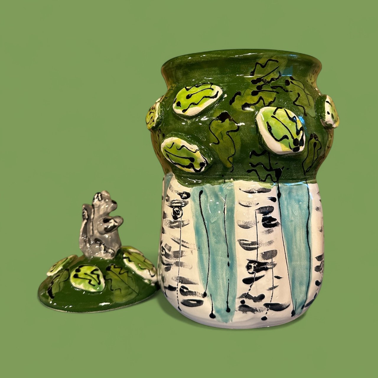 Birch Jar With Squirrel is made of low fire earthenware clay and decorated with bold majolica glazes. This is a one of a kind pottery piece and is the perfect gift for the lover of the great outdoors in your life or as a treat to yourself!