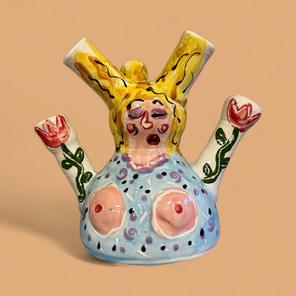 Colorful vase with whimsical imagery of blonde woman. Medusa refers to the multiple spouts just waiting for fresh cut flowers. Made of low fire white earthenware and majolica layered glazes. A stunning addition to anyone’s interior.