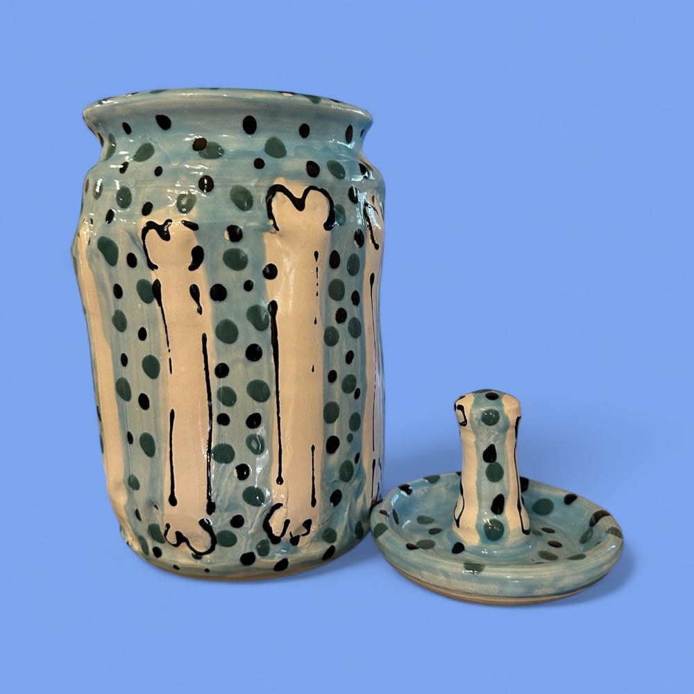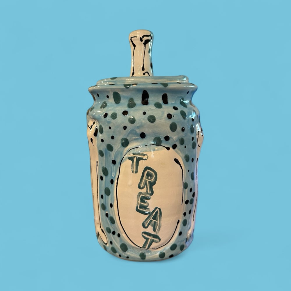 Dog Treat Jar is bound to become a favorite for at least one furry friend in your household. Made of low fire white earthenware and decorated with bold majolica glazes. A must have for any did Dad or Mom!