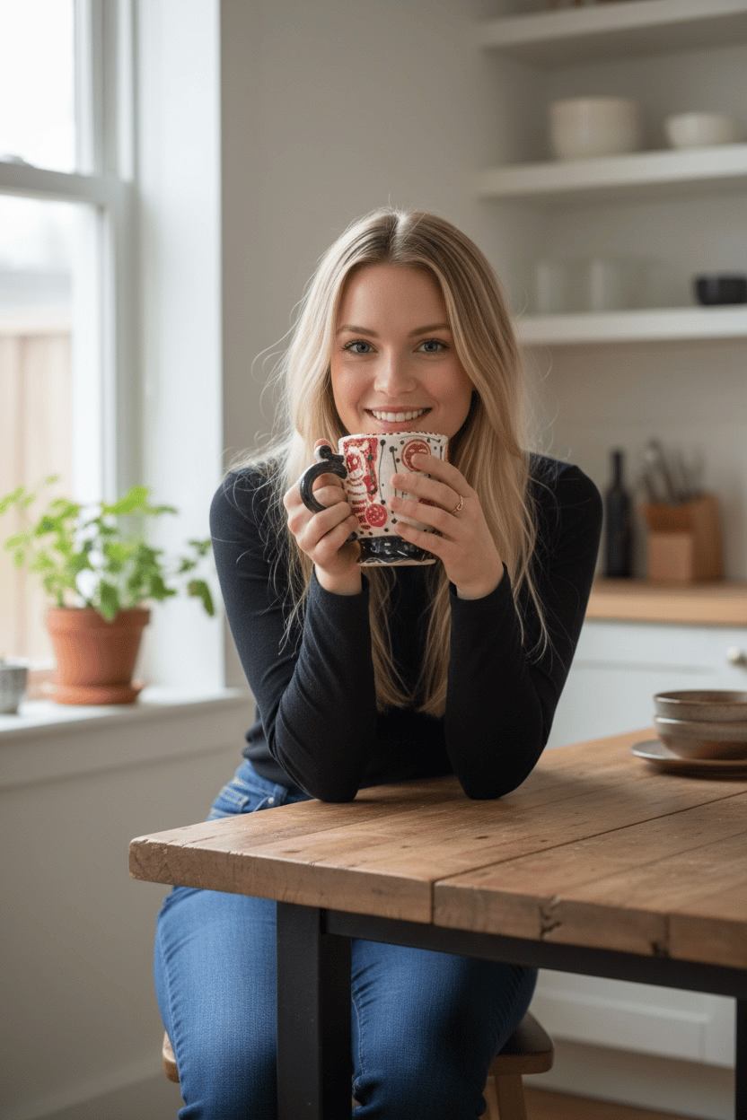 The More is More Mug Red & Black is part of a fun experiment in decoration vs function. The More is More Mug is overly decorated and may not be the most functional mug you’ve ever come across. But, if you enjoy color, whimsy and decoration, this may be the perfect pottery mug for you. Hand thrown on a potters wheel then altered out of white earthenware clay and decorated with bold majolica glazes. Precious gold lusters were added in a separate firing. The perfect gift for that “more is more” person in your life…. Or maybe you have finally given into the urge to treat yourself!